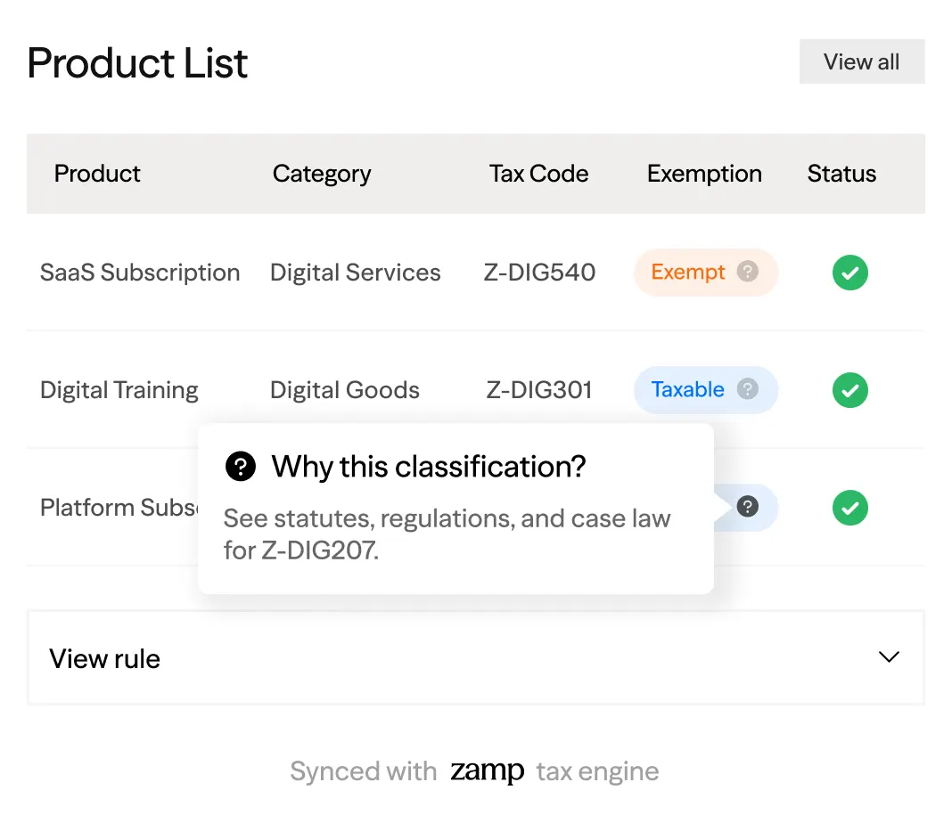 Once connected, Zamp takes over all tax calculations. Your existing tax settings won’t interfere, Zamp’s calculations override them to ensure accuracy.