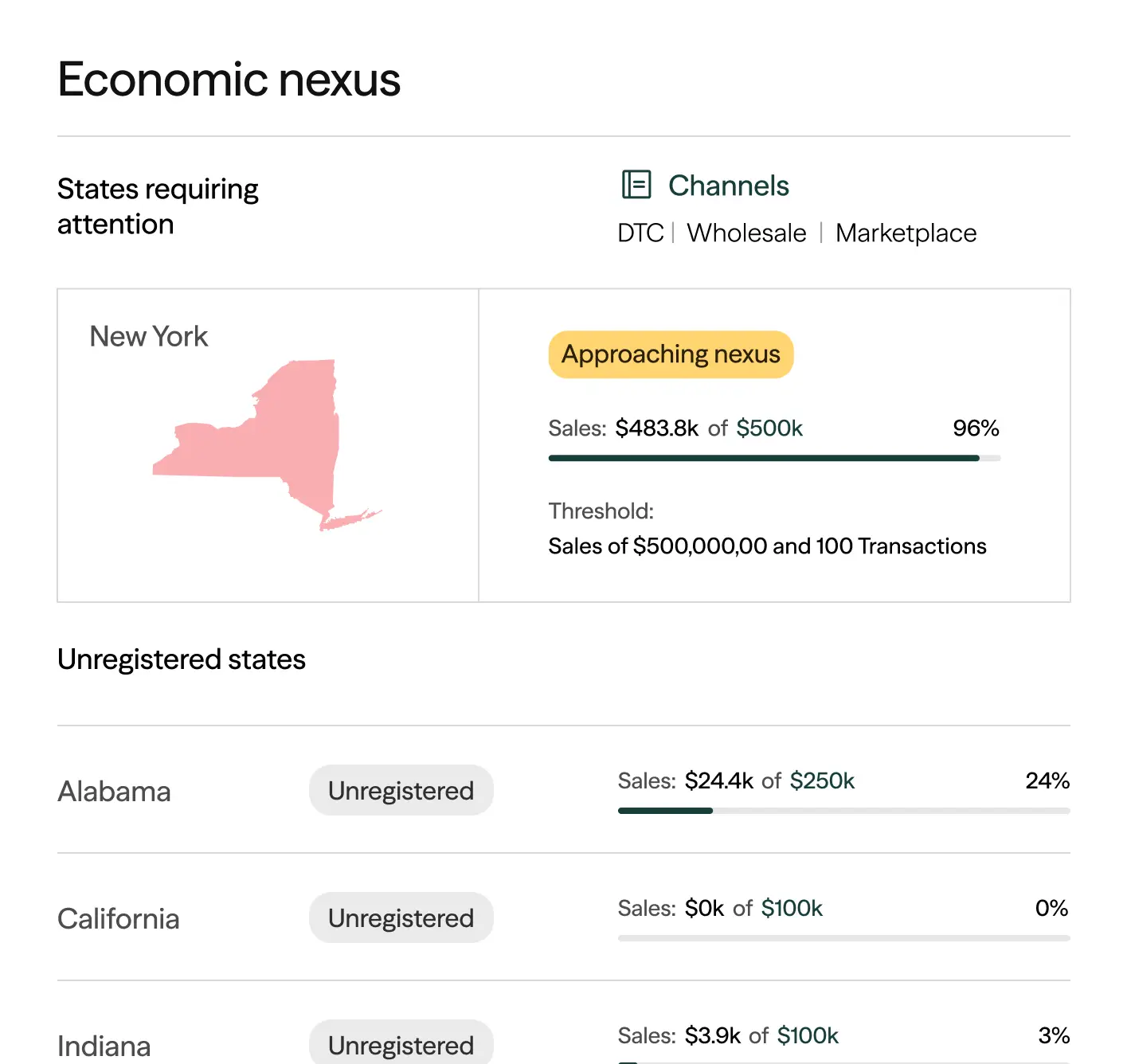 Economic and physical nexus tracked in real time across all sales channels.